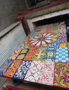 Un tavolo circolare da esterno con un top in piastrelle di ceramica colorate, ornate e dipinte a mano, con un motivo radiale e un motivo floreale, abbinato a due sedie in ferro battuto.