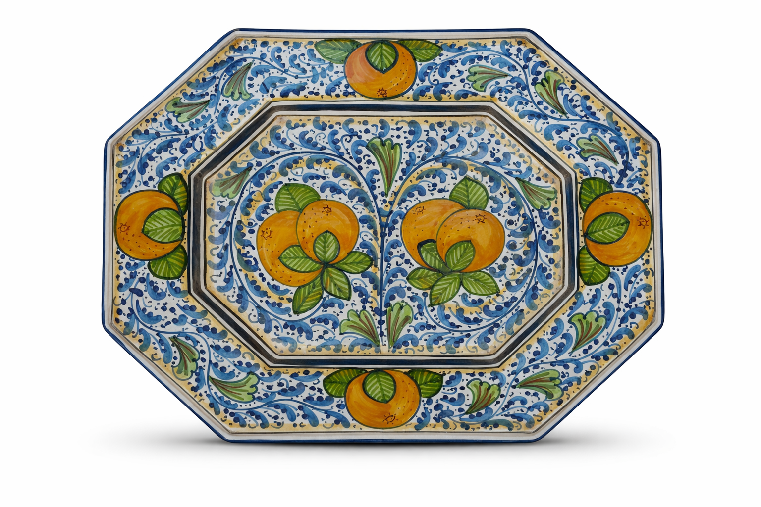 Questo vassoio ottagonale, realizzato e decorato interamente a mano in ceramica di Caltagirone, celebra l’iconografia più autentica dell’isola: gli agrumi dorati incorniciati da eleganti volute blu in stile barocco mediterraneo.