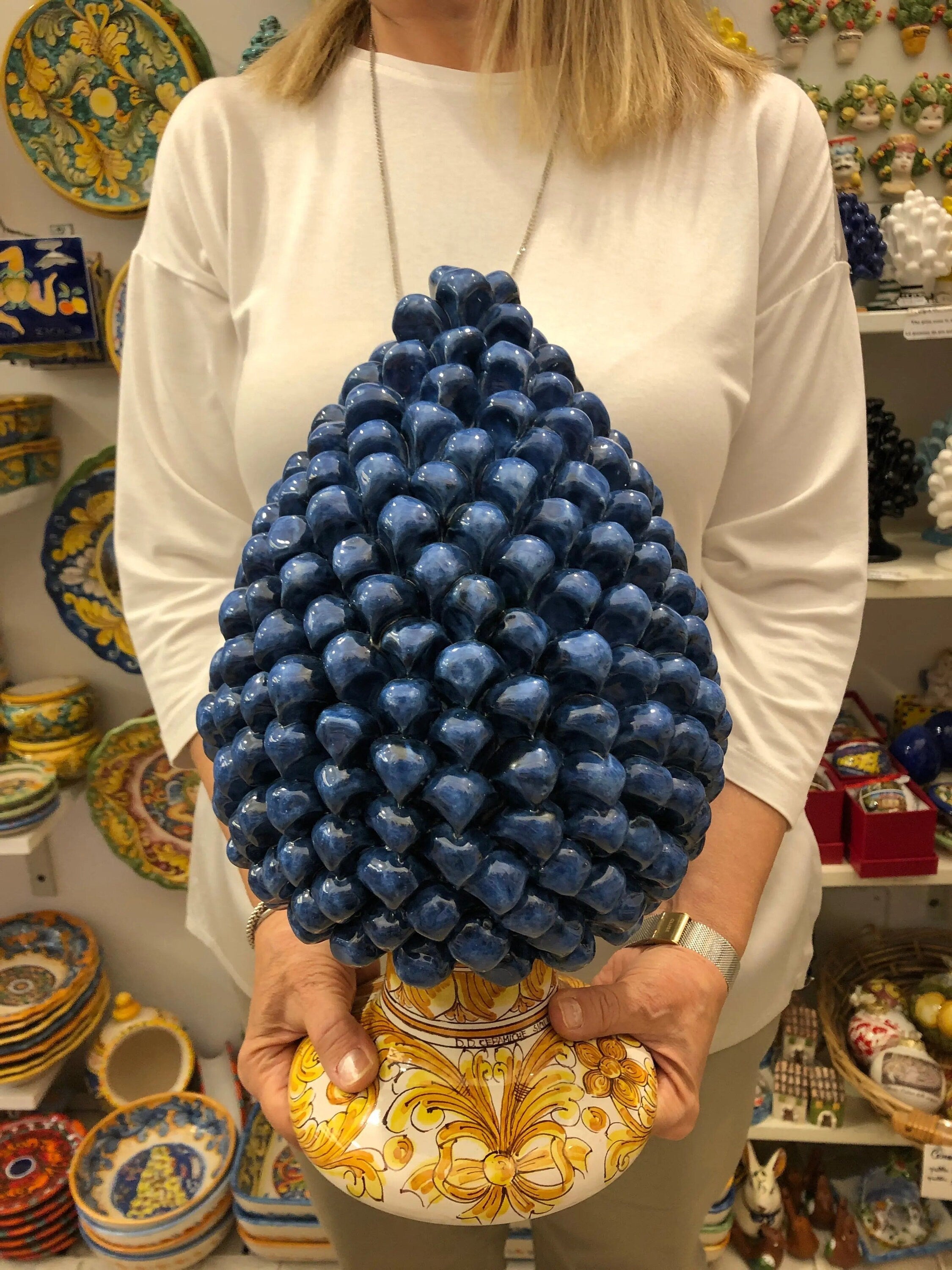 Pigna Ceramica Caltagirone cm H.35 Artigianale Blu Antico Base Decorata